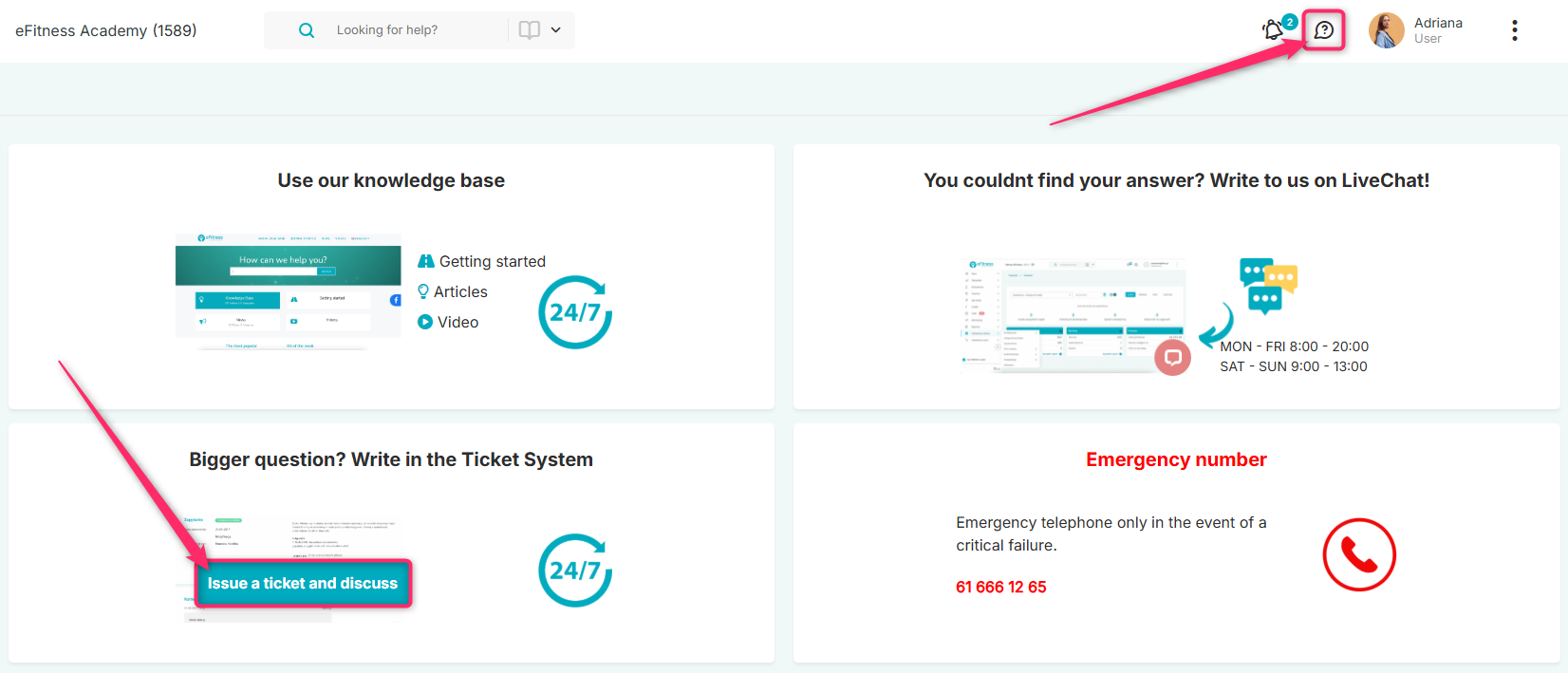 To submit a request, click the icon with a question mark in the upper right corner, then click the Issue a ticket and discuss button: