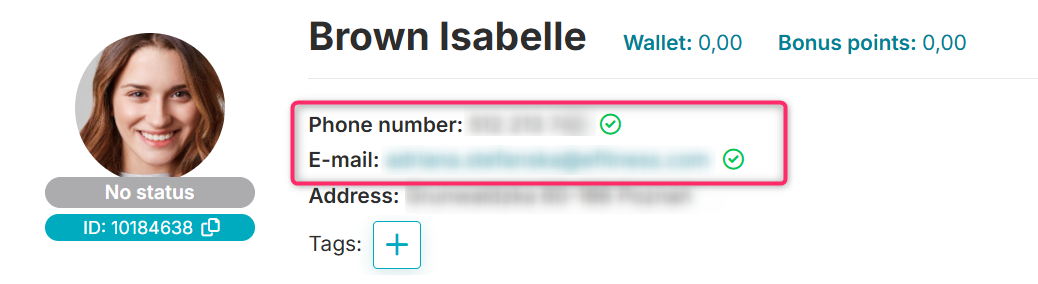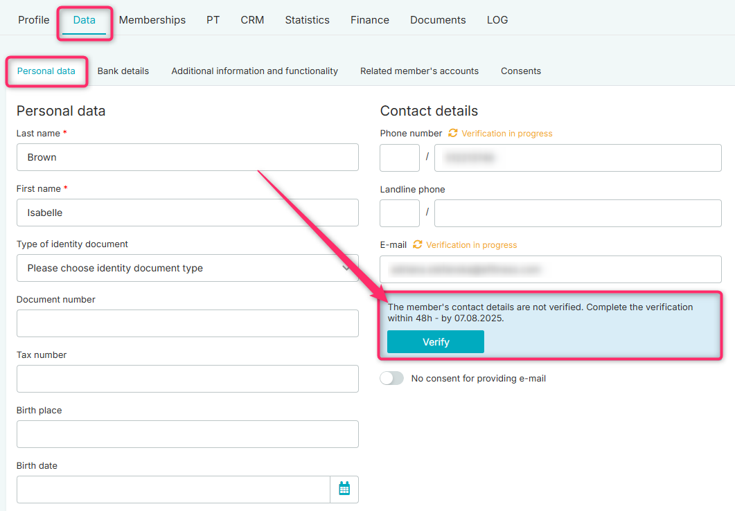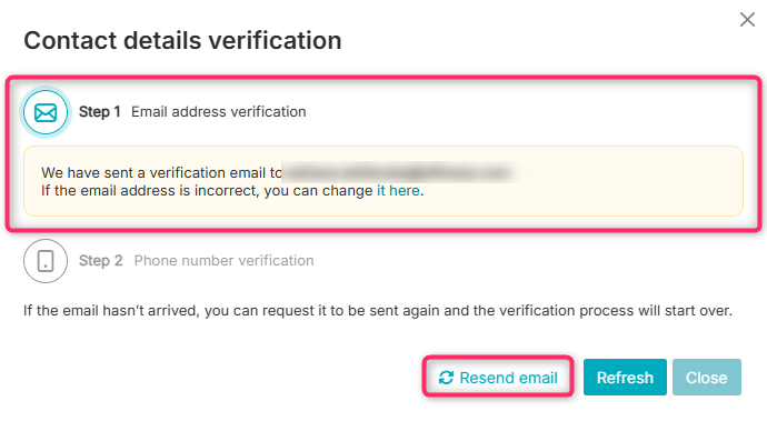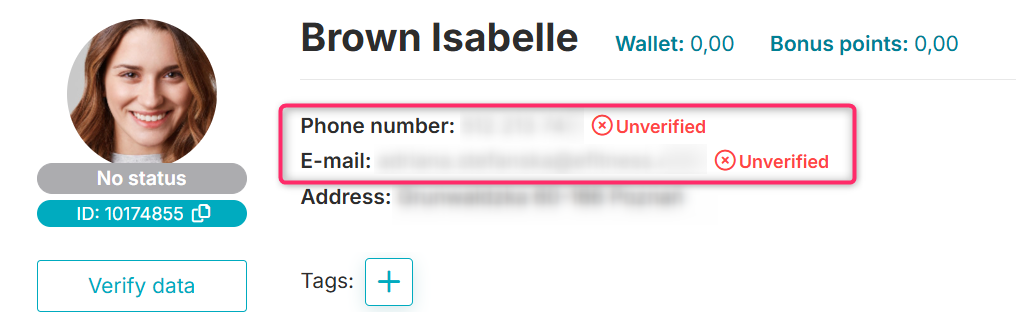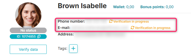 a) Verification in progress – this means the data is currently being verified. A verification email and an SMS with a code have been sent. This status is visible for two days, after which it changes to Verified (if successful) or Unverified.