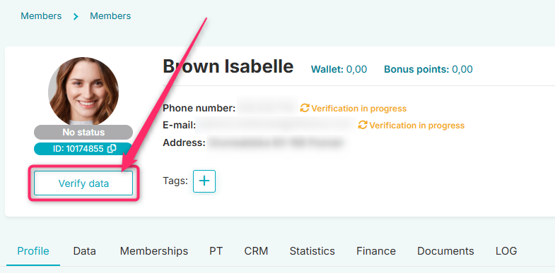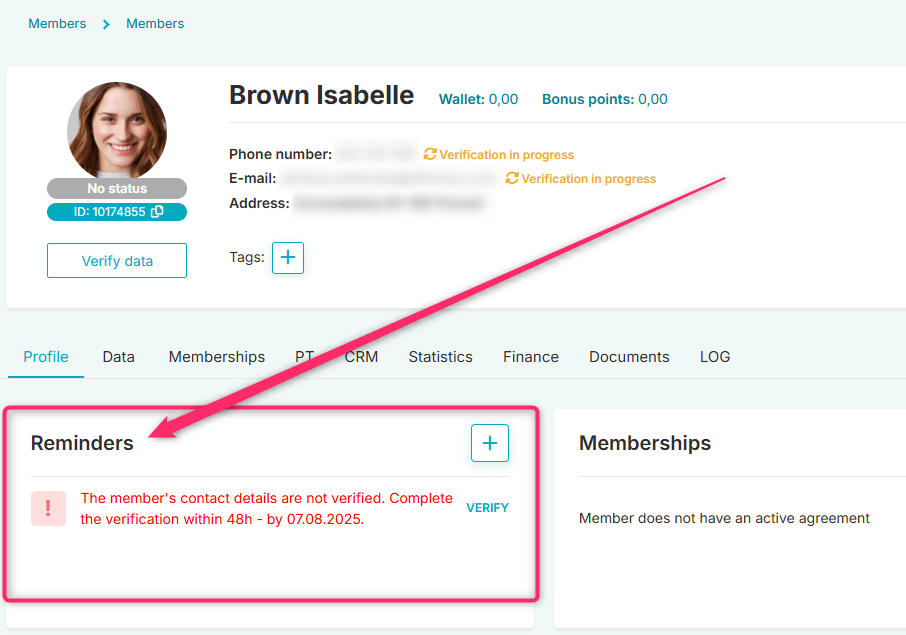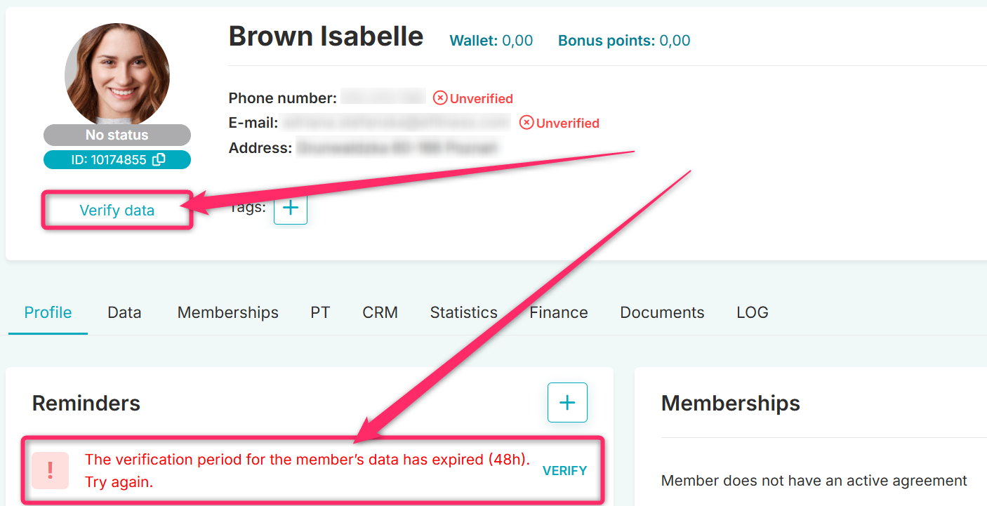 If the member does not complete the verification within the allotted time, it will be possible to resend the verification email by clicking the Verify Data button on their profile or the Verify option in reminders:
